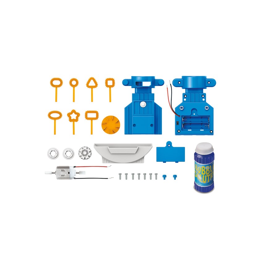 - Vsebina kompleta: Vsebuje vse potrebne dele za sestavo robota in pripomočke za ustvarjanje mehurčkov (razen milne raztopine).