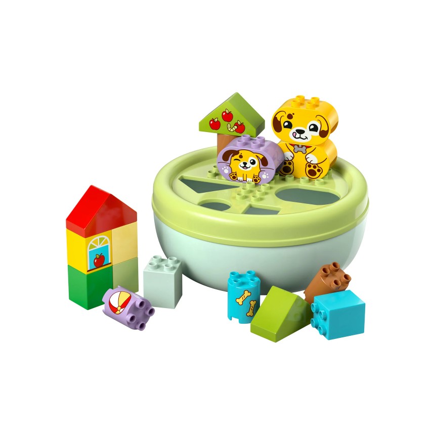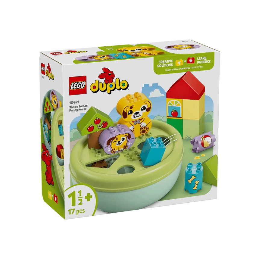 Učenje skozi igro z LEGO® DUPLO® Razvrščanje Pasja uta, ki v igro vabi najmlajše z ljubkimi mladički in pisanimi oblikami. Malčki lahko sestavijo prostor za igro pod drevesi, nato pa se zabavajo z metanjem žogice, hranjenjem psičkov ali spuščanjem oblik skozi pokrov sklede. Pokrov se trdno pritrdi, zato je tudi pospravljanje hitro in preprosto! Skozi igro otroci razvijajo prostorsko razumevanje, osredotočenost in motorične spretnosti – vse to v varnem, zabavnem okolju, ki spodbuja učenje.