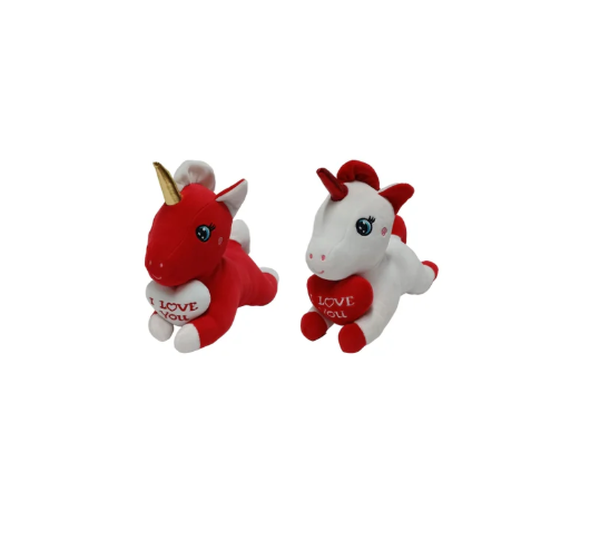 Ležeča plišasta igrača samorog s srčkom v dveh različnih barvah